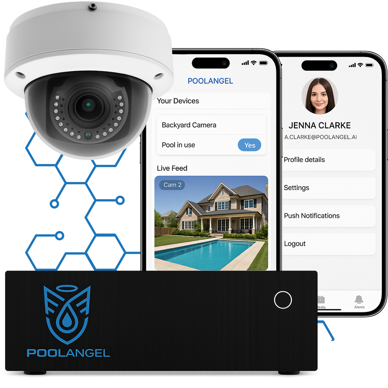 The package includes pose analysis enabling the system to detect slips and falls. Additional smarts include alert to a person being underwater, detection of shifts in camera position, learning from false alerts and the option to add family / guests to the account.